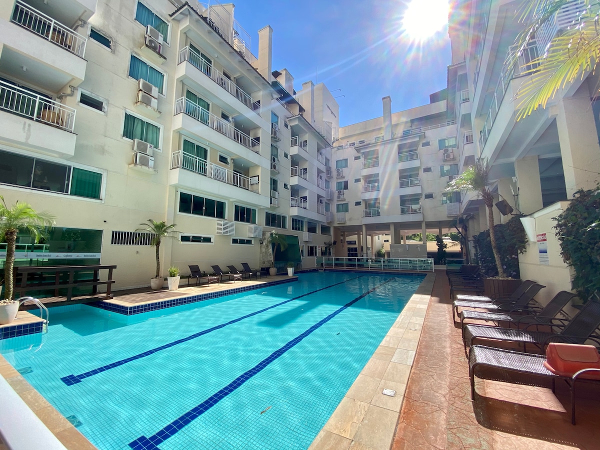 Apartamento de 1 dormitorio ubicado en uno de los condominios más completos de Bombinhas, ubicado a 400 MT de la playa de Bombas, varias piscinas además de 2 climatizadas, gimnasio, parque infantil, espacio para niños, sala de juegos, sala de cine, sauna además de tener un balcón con asador y hermosa vista, estacionamiento, wi-fi, cuarto de lavado con lavadora dentro del departamento.