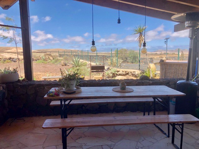 Acogedor apartamento equipado con todo lo necesario para pasar unos días de relax. Aire acondicionado, cama cómoda y aparcamiento privado frente a la puerta de la casa. ¡Gracias a su ubicación estratégica, es ideal para unas vacaciones para descubrir Fuerteventura y sus maravillosas playas! Ubicación tranquila ideal para el «smart working». Zona exterior amueblada y amplia para comer, tomar un aperitivo, tender la ropa o guardar el material deportivo.