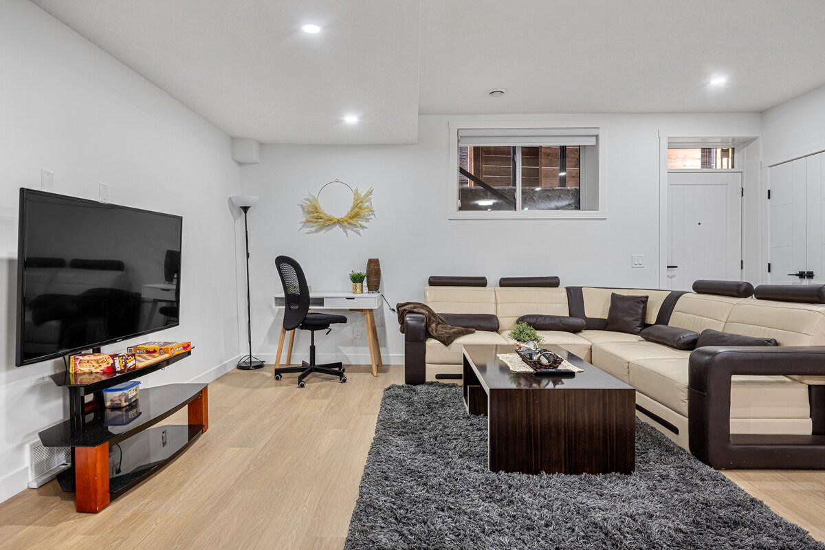 Amplia suite en el sótano con entrada independiente/privada, gran sala de estar, dormitorio grande y cocina completa con barra de desayuno. Incluye lavandería en la suite, suelos radiantes en el baño, TV de pantalla grande y zona de oficina en casa. Cerca de la Universidad de Mount Royal, el embalse de Glenmore, el casino Grey Eagle y a poca distancia a pie de múltiples restaurantes, parques y tiendas. A 10 minutos en coche del centro de Calgary, a 30 minutos del aeropuerto y con vistas a las montañas justo al final de la calle. Transporte público a 3 minutos a pie.