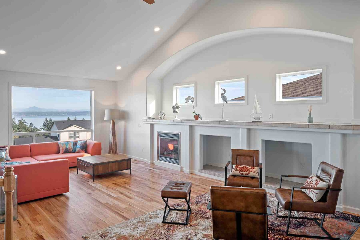 Relájate en esta casa de 2 pisos y 2900 pies cuadrados renovada con vistas panorámicas a Puget Sound y las Cascadas. Mucho espacio para una familia numerosa o dos familias que viajan juntas. Habitación principal con cama tamaño queen, baño y chimenea. Dos dormitorios más con 2 camas individuales y una cama nido. Estudio con sofá cama. Cocina completa con electrodomésticos de granito y acero inoxidable. Barbacoa de gas para barbacoa. Dos chimeneas de gas para noches frescas. Disfruta del jacuzzi, descansa en la hamaca o asa nubes en la hoguera. A minutos de parques, playas y tiendas.