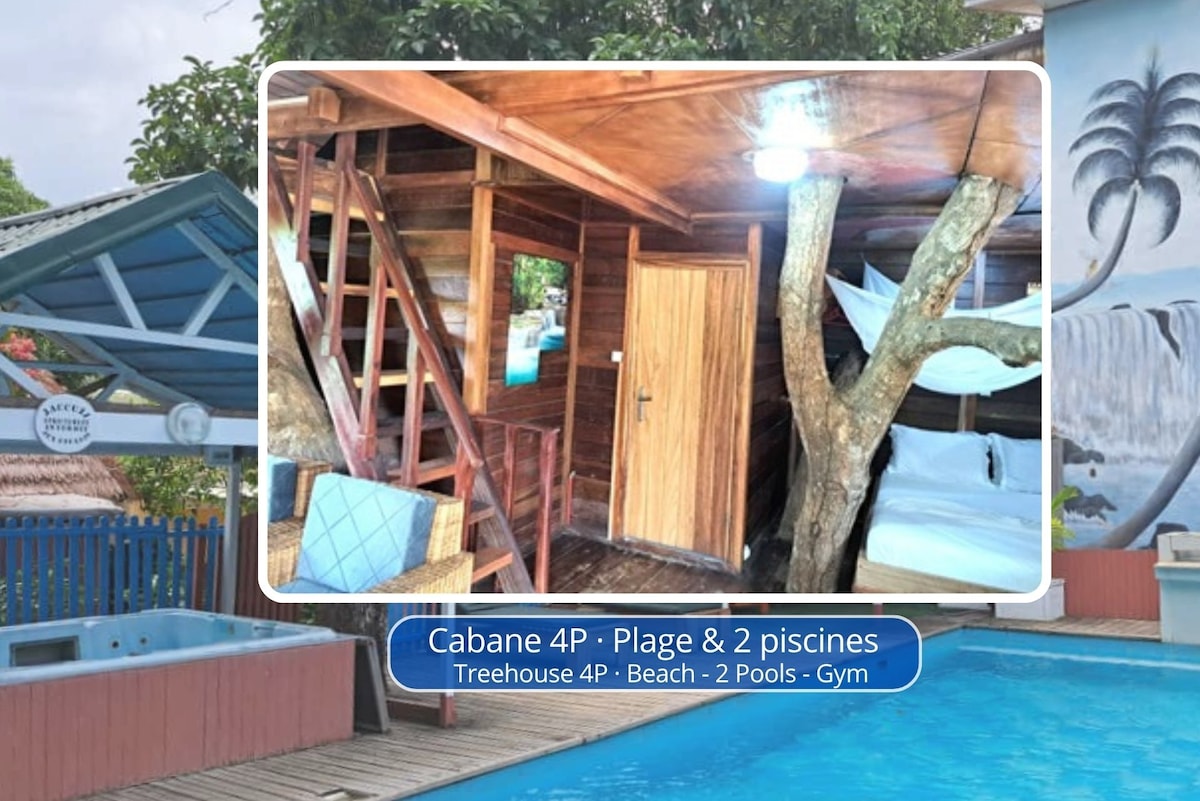 Cabane perchée en bois d'azobé local pour un séjour insolite au cœur de la nature. Ambiance “retour aux sources” dans un écrin de verdure. Idéale pour couples ou petites familles en quête de reconnexion. Accès aux infrastructures de l’hôtel pour allier confort et aventurement