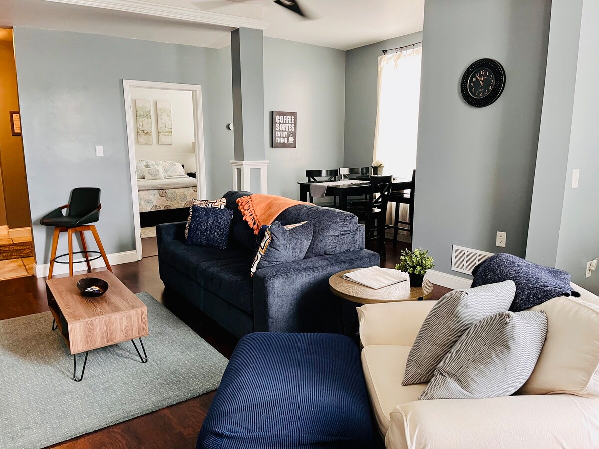 ¡Esta ubicación es lo mejor de ambos mundos! ¡Un barrio seguro, tranquilo y transitable a solo 5 minutos de un moderno centro de vida nocturna transitable sobre el Rin! Ofrece 1 dormitorio bien diseñado, una amplia cocina y sala de estar, lavandería gratuita en el alojamiento, café, té y WiFi gratuitos. El televisor viene precargado con HBO Max, Hulu, Netflix y Amazon Prime Video. Fácil acceso a los parques de béisbol y museos! Camina hasta el bonito Bowtie Cafe del vecindario cercano o escucha música en vivo en el Blind Lemon.