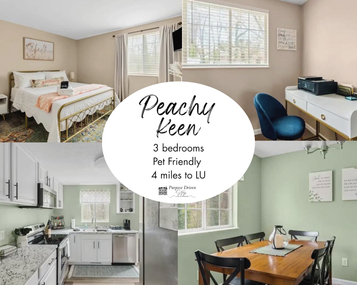 ¡Esta cómoda casa que llamamos «The Grove» se encuentra en una ubicación IDEAL! - Barrio tranquilo a 2 minutos de Target, MUCHOS restaurantes y tiendas. - A 5 minutos de la Universidad de Liberty, a 4 minutos del aeropuerto y a 14 minutos de la Universidad de Lynchburg. - Gran patio delantero y trasero para que jueguen niños y mascotas. - Barrio transitable. - Fácil acceso a la 460 para excursiones de un día a lo largo de Blue Ridge Pkwy. - Mucho aparcamiento, futbolín, canasta de baloncesto, televisión por cable y un hermoso patio arbolado.