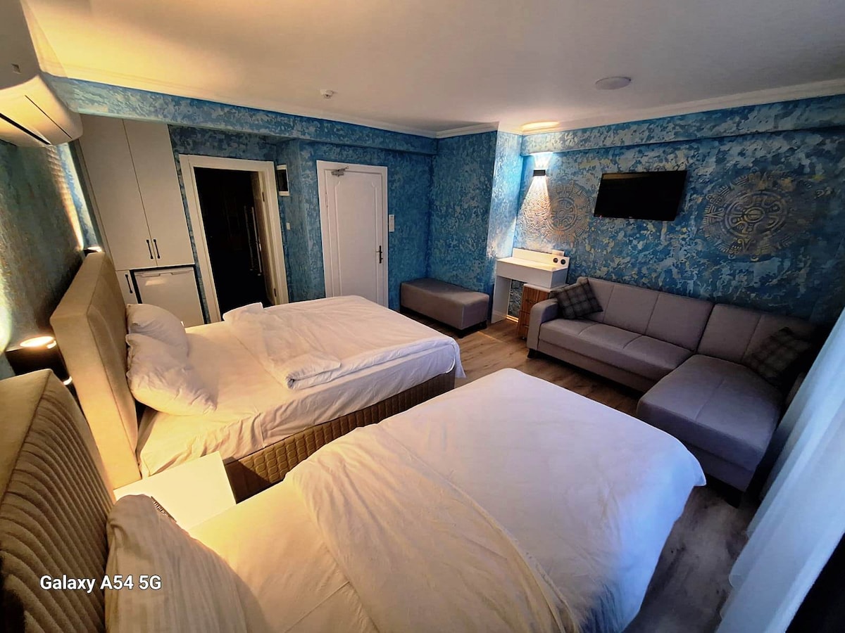Merkezi konumu ile her şey ayaklarınızın altında.. 4 Kişilik müstakil odamız hem aileler hem de kalabalık arkadaş grupları için sizleri bekliyor. Odamızın içerisinde mutfak, mutfak araç gereçleri, led tv, 7/24 sıcak su, buzdolabı, internet ve sadece size ait balkon mevcut. Plajın hemen 1 sokak arkasında yer almakta olup plaja ve barlar sokağına yürüyerek sadece 1 dakika sürmektedir. İskeleye ise 3 dakikalık mesafede bulunmaktayız. Şimdiden iyi tatiller dileriz.
