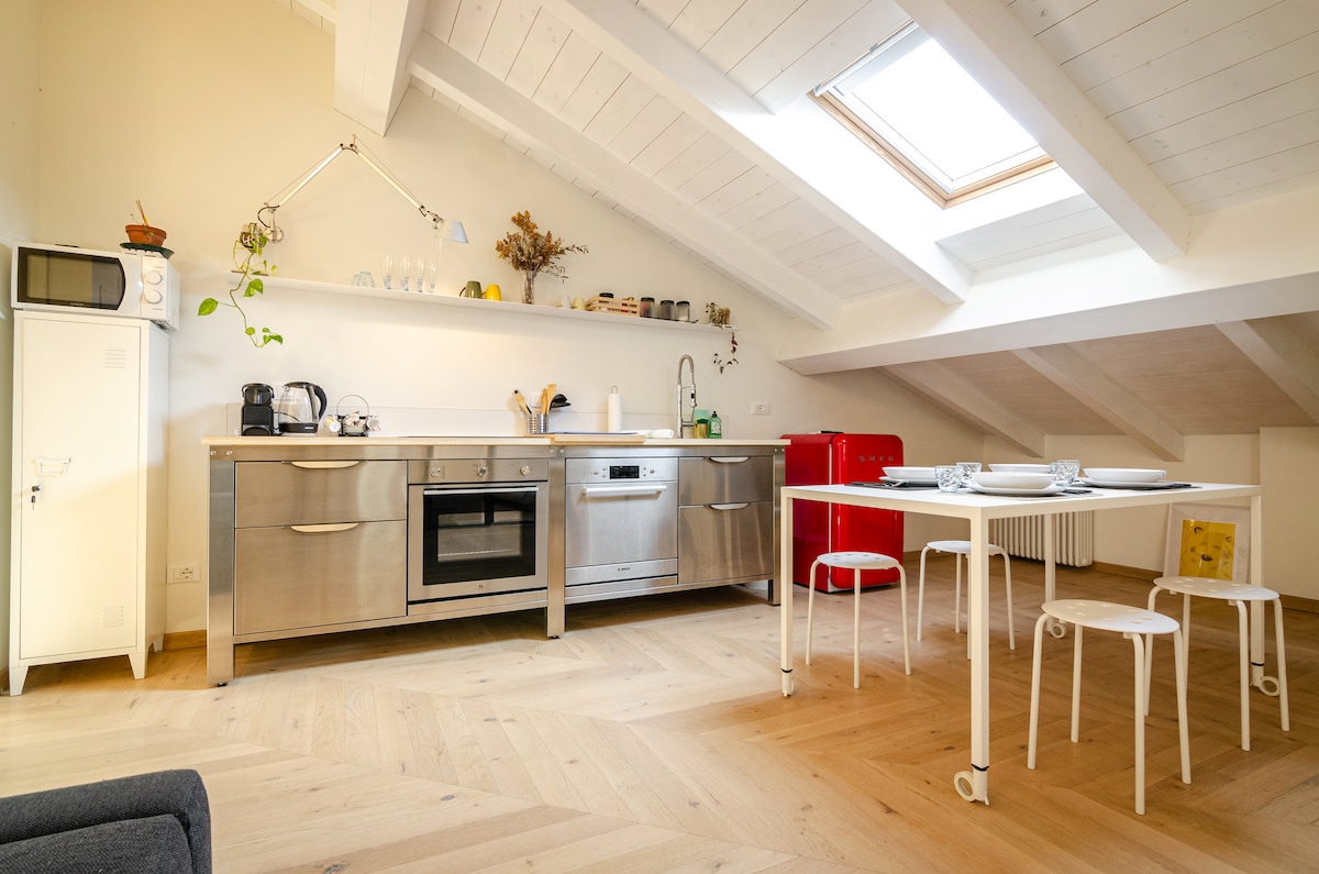 El apartamento está situado en el último piso de un antiguo edificio equipado con un ascensor acristalado en el corazón de la medieval Bolonia, justo enfrente del Teatro de la Ópera del siglo XVII. Acogedora, panorámica y soleada, una tranquila logia privada se abre a los patios interiores y ofrece excelentes vistas de los tejados, los pinos seculares y las dos torres medievales.