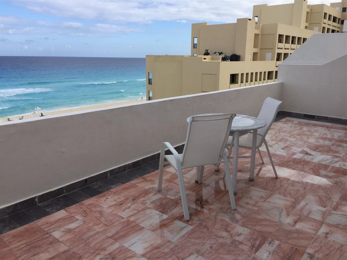 Acogedor Estudio ubicado en lujoso condominio frente a la playa y el mar Caribe. Cuenta con una alberca enorme, situada al lado de la playa y con una hermosa vista al mar Caribe, Isla Mujeres y la Zona Hotelera. Además, podrán disfrutar de unas preciosas vistas de la ciudad de Cancún y su mágico atardecer. Ideal para parejas Incluye el servicio de Concierge privado gratuito.