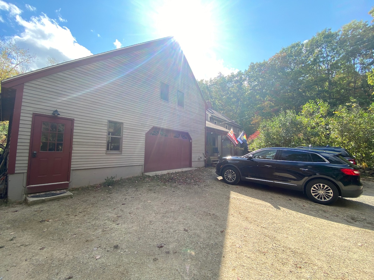 Rustic guest suite on serene four acres. Abutting colonial cape style house and West Lebanon Historic District date back to early 18th Century. Private parking & entrance, queen memory foam mattress, steam sauna, kitchen and laundry supplies, and desk and high speed wifi for telework. Minutes from Skydive New England, Prospect Hill Winery or McDougal Orchard. 30min to Portsmouth NH, Maine beaches, and Lake Winnipesaukee. Just over an hour to the White Mountains, Portland ME or the Boston area.