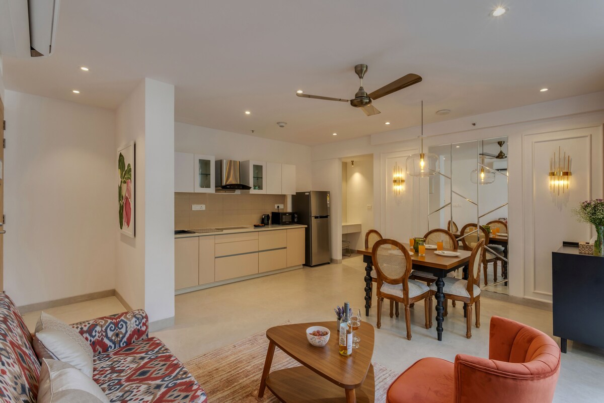 At Ananta Collective, Experience North Goa at its finest in this beautifully designed 1BHK luxury apartment nestled in the serene neighborhood of Nerul, just minutes away from Candolim, Coco, and SinQ Beach. Step into a world of modern interiors, elegant finishes, and thoughtful details that blend comfort with style. The apartment features a spacious living area, a fully equipped kitchen, and a cozy bedroom with premium bedding — perfect for couples or small families seeking a relaxing getaway.
