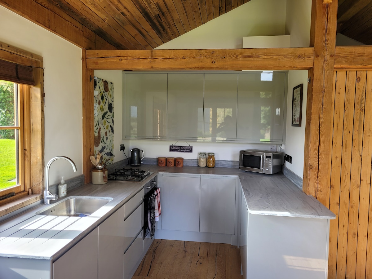 Remolque Howitzer de 1941 convertido encontrado en una granja, convertido con cariño en un hogar lejos de casa. Recientemente cambiado para funcionar con energía solar. Contiene cama tamaño king, cocina con horno microondas de convección y parrilla, placa de inducción, nevera con congelador, baño con ducha de tamaño completo, calefacción eléctrica, TV y wifi. Sillones, mesa plegable y sillas. Pequeño patio con barbacoa y tumbonas, estacionamiento para un coche. Ubicación rural con vistas a campos abiertos. Pequeño pueblo con tienda y pub.