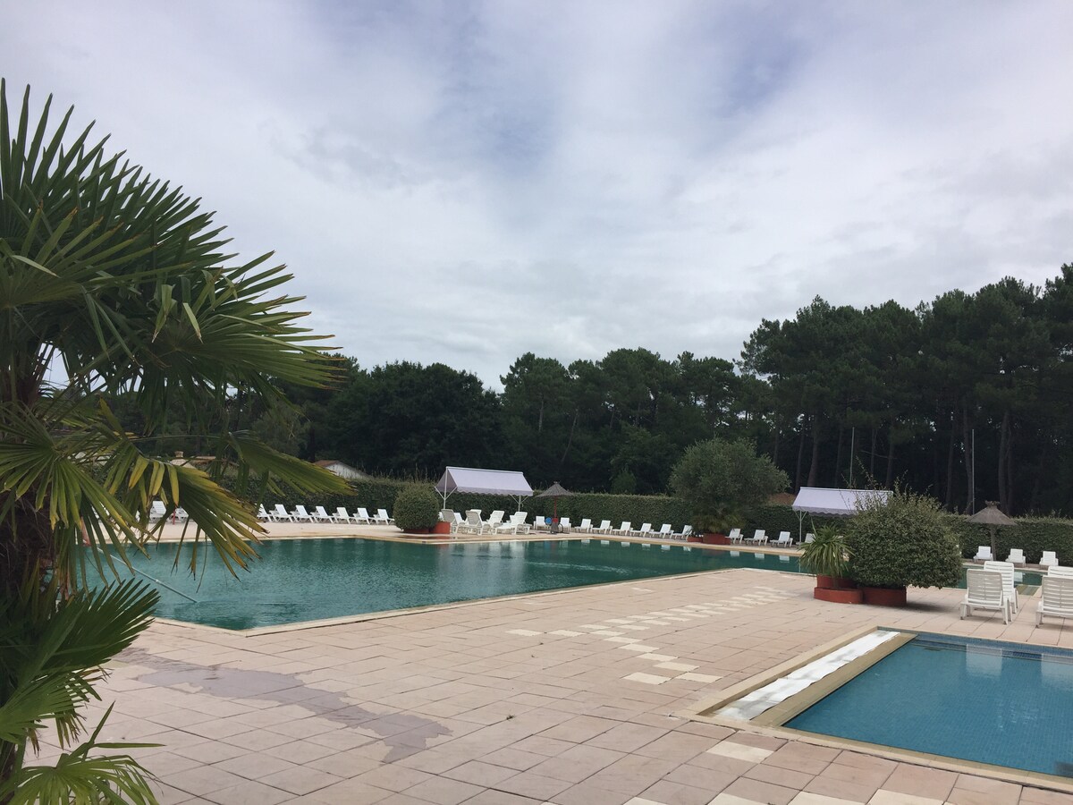 * Ideal para familias, parcela sombreada/vallada, Wifi gratuito * Chalet de 35 m2 + terraza cubierta y cerrada de 10m2 (posibilidad de apertura total cuando hace buen tiempo), terraza baja de 22 m2 con tumbonas/chilenas * Piscina con toboganes (mayo-septiembre) * Parque residencial de ocio de 4 estrellas, en el corazón del bosque, muchas actividades: tenis, Accro-Park niños, City Stadium, áreas de juegos para niños, restaurante-bar tienda de comestibles... * A 15 minutos duna de Pyla, Arcachon, Aqualand, zoológico, playas oceánicas...