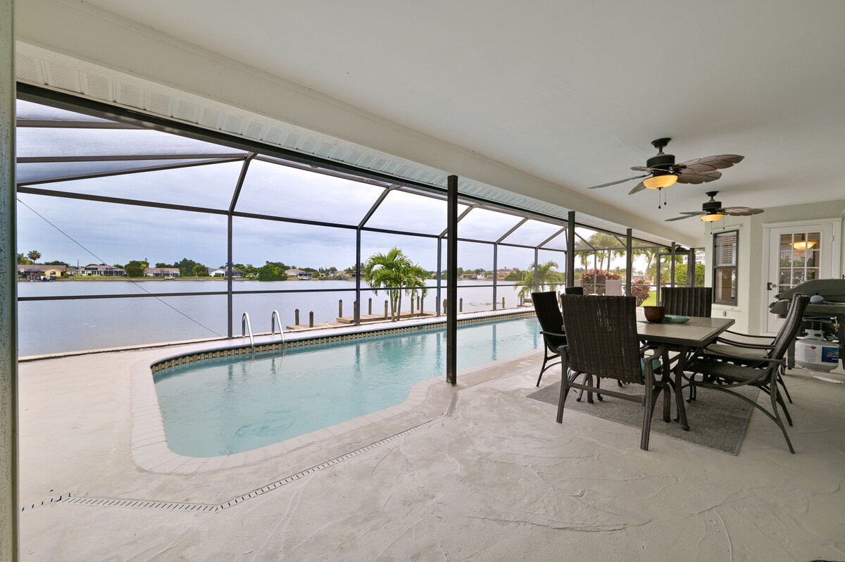 DESCUENTOS: Semanas... 1 = 10 %, 2 = 15 %, 3 = 20 %, 4 = 25 %. ¡Te damos la bienvenida al «Oasis»! ¡Escápate al agua y alójate en un canal en el hermoso Cabo Coral! Disfruta de esta casa de 3 dormitorios y 2 baños. ¡Nada en la piscina, siéntate en el patio, pesca desde el muelle, siéntate en el bar tiki para tomar una copa o echa una siesta en el lanai para escapar de todo! Hay un muelle de 50 pies de largo con 30 y 50 amperios, ¡así que trae tu barco! ¡Se puede acceder al golfo en barco y a las actividades y playas cercanas de Ft Myers Beach y Sanibel/Captive Island!