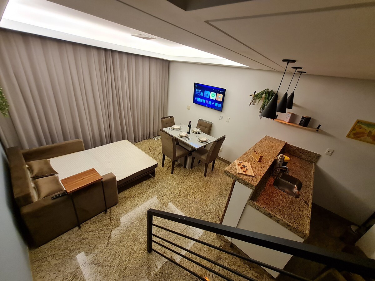 Nosso flat é super moderno e está localizado a poucos minutos do centro, perto de grandes supermercados como Assai, Atacadão e Santa Helena. O flat é equipado com TV, armários embutidos, sofá retrátil, mesa para 04 pessoas, utensílios de cozinha (talheres, copo, xícara, panelas e etc), cooktop, geladeira, microondas, cama de casal e muito mais! Possuímos ainda estacionamento privativo. Nosso flat foi pensado para você que busca conforto e praticidade.