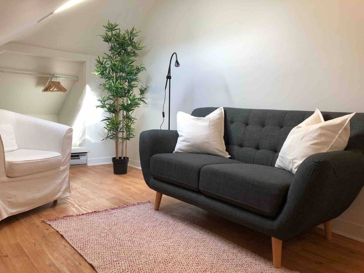 Habitación en el ático de una casa centenaria con entrada exterior independiente y aparcamiento privado con estación de carga para vehículos eléctricos, a pocos pasos de las llanuras de Abraham en el barrio de Montcalm. La ubicación es ideal, a poca distancia de las principales atracciones y festividades. La unidad es perfecta para un viajero solo o una pareja. Tiene un pequeño baño privado con ducha. Los huéspedes disponen de un minifrigorífico y un microondas.