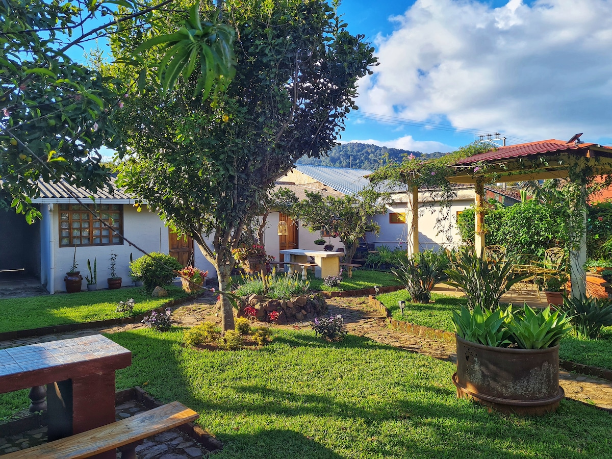 Estancia ubicada dentro de una propiedad privada e independiente, un lugar seguro justo entrando a Apaneca sobre carretera principal accesible a todos los atractivos de la zona, cuenta con 2 camas queen,1 sofá cama, una salita, TV con cable, wifi, baño con agua caliente, cocina tipo chalet equipada con microondas, refri, horno tostador, cocina, cafetera y trastes. además tiene una parrilla afuera y terraza con mesa de madera, hamacas,columpios y fogata. *Personal encargado brinda asistencia.