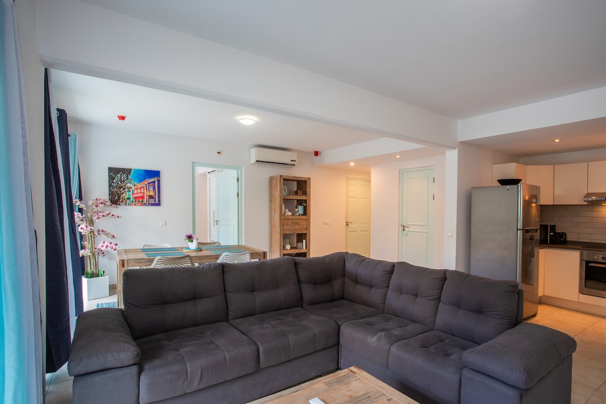Amplio apartamento moderno en una ubicación privilegiada, disfruta de un corto paseo de 7 minutos a la hermosa playa, bares y restaurantes. El apartamento es totalmente privado con entrada propia, sala de estar, baño, dormitorio con aire acondicionado, cocina y balcón. El apartamento está equipado con una nueva cama cómoda y un lujoso sofá (cama). El balcón y el jardín te invitan a sentarte, darte un baño o tomar una copa de vino mientras ves tu serie favorita de Netflix en la televisión inteligente de la sala de estar y el dormitorio.