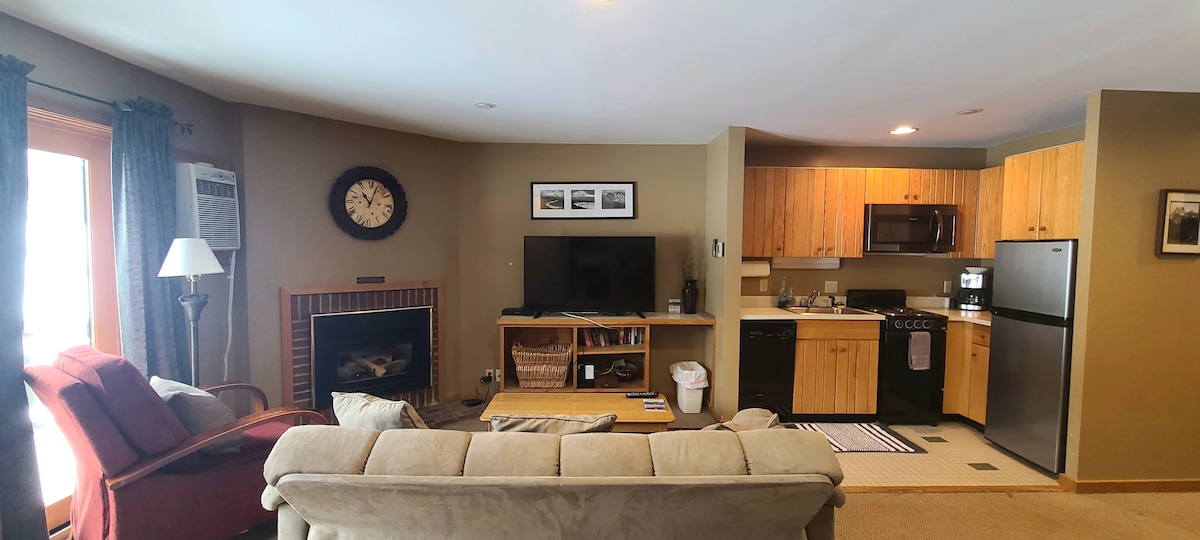 Este apartamento tipo estudio con ubicación céntrica es una opción ideal para familias pequeñas que buscan disfrutar de una escapada a la montaña. Su ubicación estratégica te garantiza que estarás muy cerca de todos los servicios esenciales. El estudio cuenta con una cómoda cama tamaño queen, literas para niños y un cómodo sofá cama con espuma viscoelástica de 6 pulgadas. ¡La cocina está equipada para preparar tus comidas familiares! Además, puedes esquiar de regreso a la puerta y relajarte junto a la chimenea de gas después de un día en las pistas.