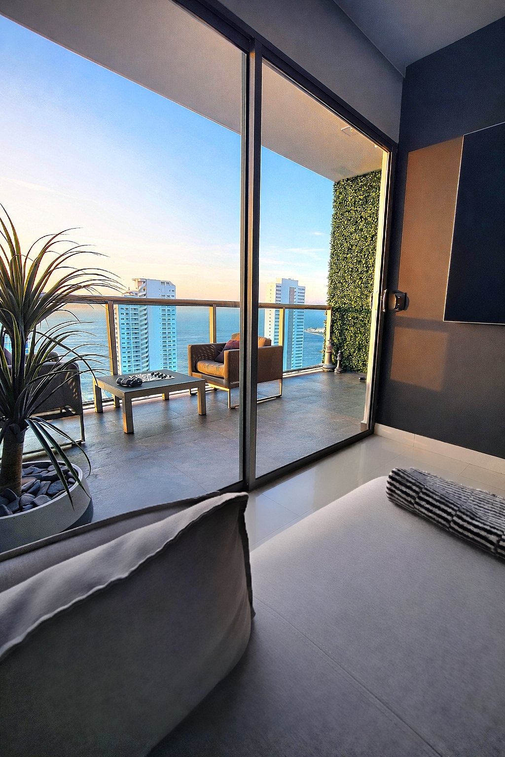 Nuestro elegante apartamento está ubicado en uno de los más completos y modernos edificios del exclusivo sector "Cielo Mar", a pocos metros de una de las mejores playas de la ciudad "Playa azul", a 10 minutos del Centro Histórico y a 5 minutos del aeropuerto. El apartamento tiene una vista Extraordinaria de la Bahía y el Océano que puedes disfrutar desde el Jacuzzi privado en el balcón o en las increíbles Piscinas infinitas en el Rooftop que cuenta Jacuzzis, Sauna, Terraza Bar & BBQ