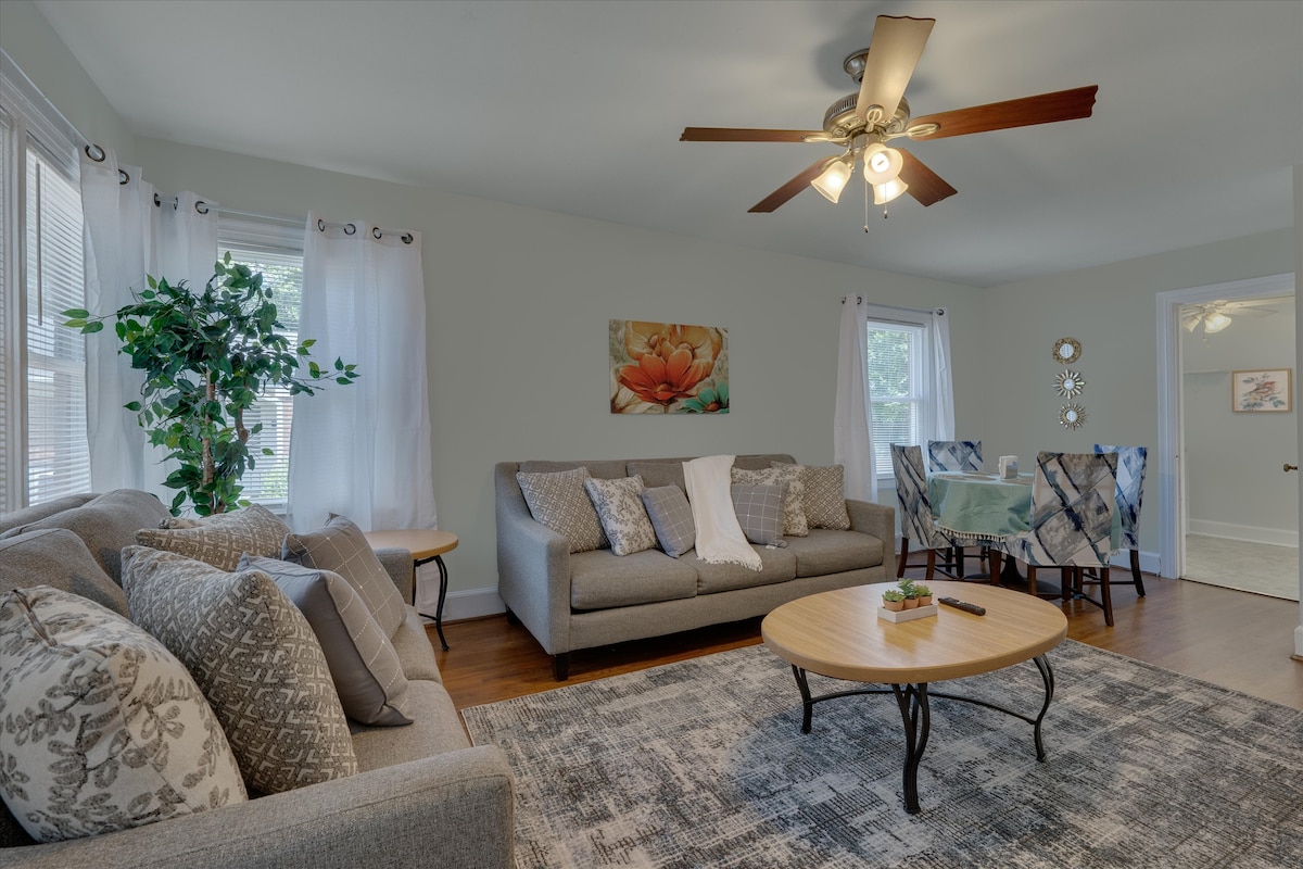 Todos los muebles nuevos y camas de calidad con sábanas y toallas blancas sin perfume; ventiladores de techo en todas las habitaciones, cómoda sala de estar con TV de 55 pulgadas. Cocina totalmente equipada para cocinar, café con crema/edulcorantes proporcionados. Lavadora/secadora de tamaño completo en el armario de la cocina. Entre el campus principal de Duke y el centro de la ciudad, a 2 manzanas de Durham Organic Grocery, Da Kine's Kava Bar, Grub Durham, Duke Gardens y Nasher Art Museum. Fácil acceso a restaurantes del centro, autopista 147, I-40, I-85, RTP y aeropuerto RDU (14 min.).