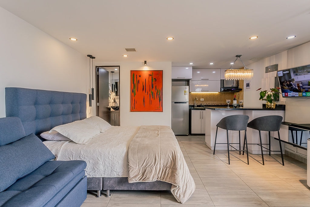 Disfruta de un estudio moderno y luminoso ubicado en una de las zonas más convenientes de Medellín. El espacio fue diseñado para ofrecer comodidad y un ambiente acogedor, perfecto tanto para estancias cortas como largas. Es ideal para relajarte después de un día explorando la ciudad o para trabajar de forma remota en un entorno tranquilo y con estilo. Cada detalle ha sido pensado para que te sientas cómodo y como en casa durante toda tu estadía.