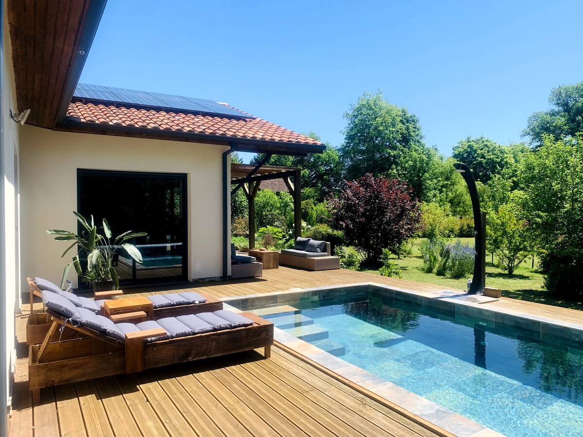 Villa contemporánea de 130 m2 de planta baja, con acceso directo a un bosque de pinos. Idealmente situado cerca de Mont-de-Marsan,del campo de golf de Saint-Avit y a menos de una hora de las costas de las Landas. Con una suite con vestidor y baño/ducha,dos dormitorios adicionales, segundo baño,cocina totalmente equipada, así como un lavadero. Jardín (1300 m2) vallado con zona de césped. Piscina de 8x4m.