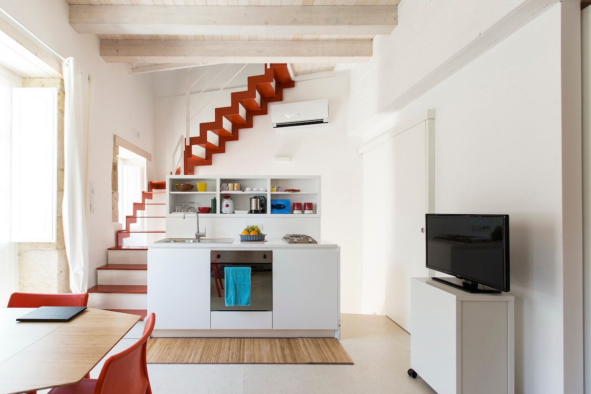 Dionisio 6 es un apartamento elegante, acogedor y cálido en la planta baja, ubicado en el barrio judío de «La Giudecca», en el corazón de Ortigia, a solo 50 metros del mar. Nuestro loft ha sido completamente renovado en 2021 a través de una cuidadosa restauración conservadora utilizando materiales de la más alta calidad con el fin de respetar las características del antiguo edificio en el que se encuentra. La funcionalidad y el diseño se han mezclado con la antigüedad de la estructura arquitectónica.