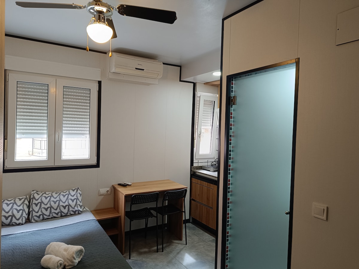 Pequeño y cómodo apartamento tipo Estudio de 24mts, perfectamente equipado con todos los elementos necesarios para descansar y disfrutar de la ciudad. Cuenta con cama de matrimonio 150cm, baño privado, Smart-TV y WIFI, cocina equipada con mesa, sillas y sillones para descansar. Posibilidad de garaje por 10€/día (bajo disponibilidad y reserva previa) Capacidad máx. 2 personas. Posibilidad de cuna y cama supletoria (solicitar información).