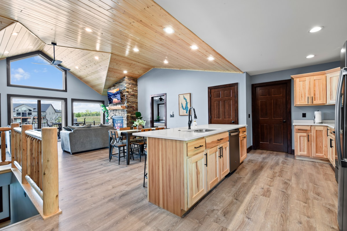 Escápate a Narrow Waters, una cabaña de vacaciones de lujo. Convenientemente ubicado entre Castle Rock y Petenwell Lakes, relájate en medio de los encantadores bosques perennes que adornan el pintoresco estrecho del río Wisconsin. Después de un día en Wisconsin Dells, sumérgete en una de las 2 bañeras de hidromasaje, luego reúnete alrededor de la acogedora chimenea o el enorme televisor 4K de 75". Duerme en la cama King premium con la parte superior acolchada, envuelta en sábanas de algodón de 1000 hilos. O elige uno de los 4 dormitorios Queen que mejor se adapte a tu estilo.