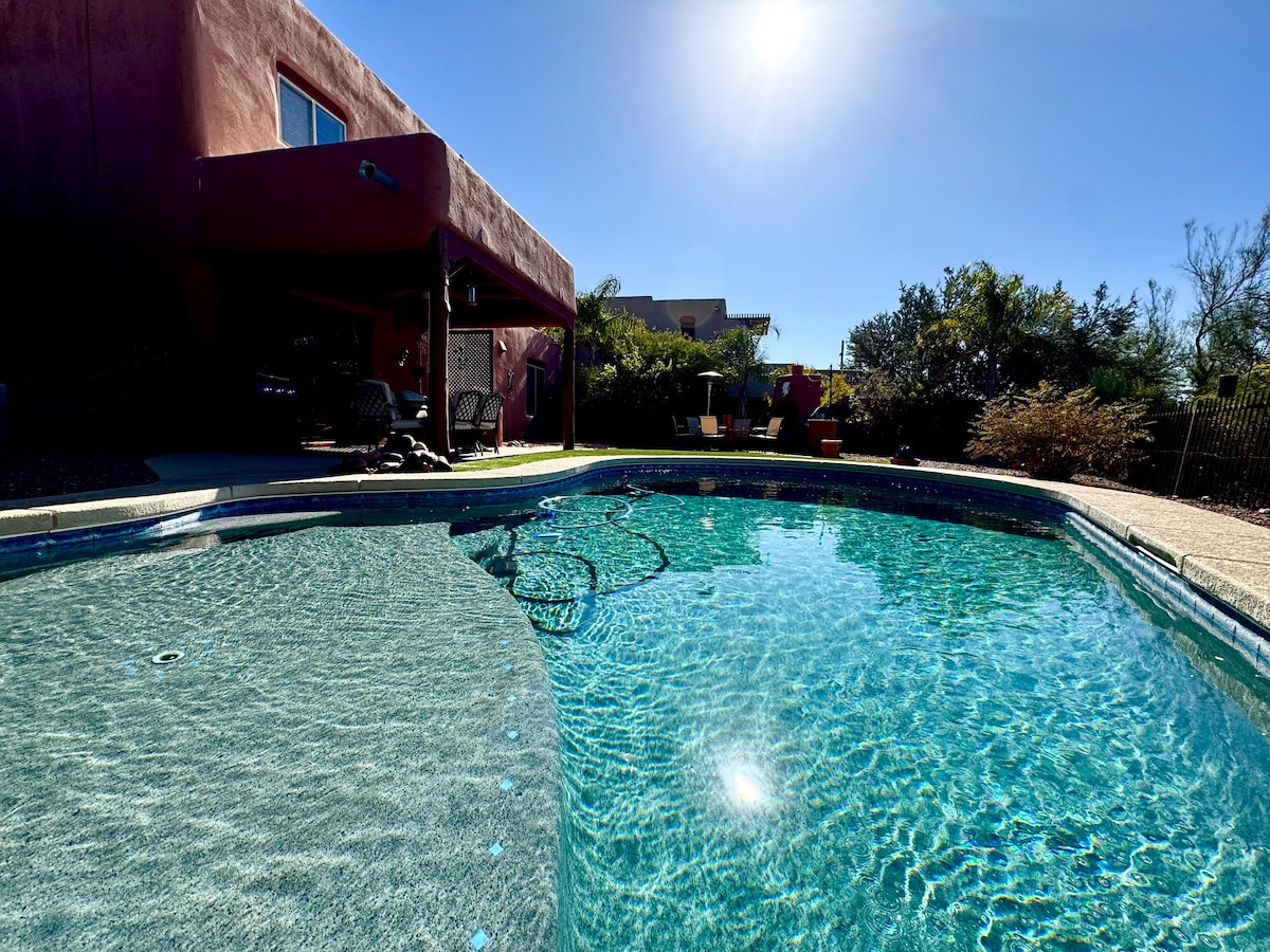 ¡Una joya oculta en Tucson! La casa es una clásica casa de estilo adobe de Santa Fe. Disfruta de todas las comodidades del hogar, relájate en el hermoso, aislado y totalmente vallado patio trasero con jacuzzi y piscina privados. El comedor tiene capacidad para 8 personas, la cocina está totalmente equipada con todos los elementos esenciales. Hay una pequeña y funcional zona de oficina con impresora y papel, y una lavandería. Hay 3 dormitorios cómodos con televisores inteligentes, Internet rápido, ropa de cama de alta calidad y ventiladores de techo.