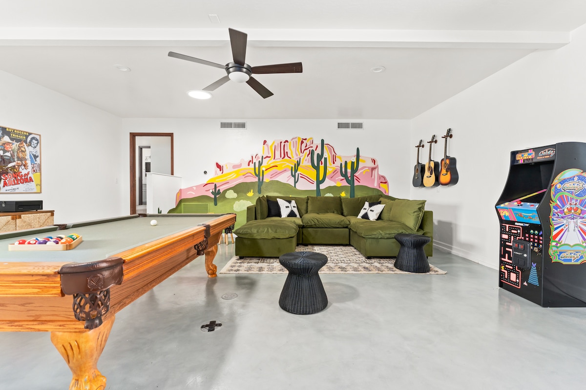 Le damos la bienvenida a un refinado refugio en el desierto con vistas panorámicas, una piscina privada y una sala de juegos completa, ideal para estancias grupales de alto nivel. La espaciosa distribución ofrece múltiples áreas de estar y una transición fluida entre el interior y el exterior, ideal para reunirse sin sentirse abarrotados. Disfrute de las mañanas con vistas al desierto, de las tardes soleadas junto a la piscina y de las noches de relax en la sala de juegos. Diseñado para ofrecer comodidad, conexión y escapadas inolvidables en Tucson.