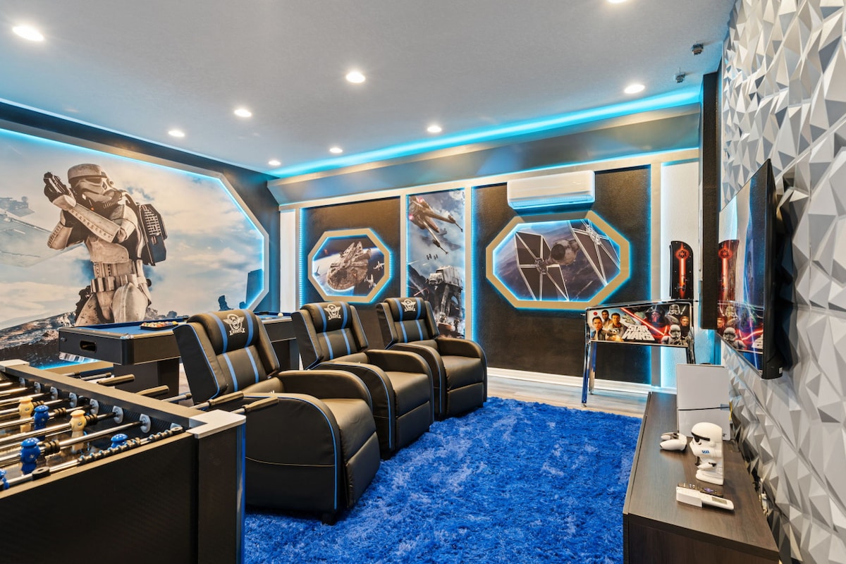 Villa de lujo en Kissimmee, FL, ¡perfecta para familias y grupos! • Capacidad para 16 personas con 6 dormitorios, 6,5 baños, 10 camas. • Disfruta de una piscina privada y spa, sala de juegos con PS5, Nintendo Switch y arcade, cine en casa, gimnasio y estación de música. • Dos habitaciones temáticas que dan vida a la magia de Disney y Harry Potter. • A solo 6,9 millas de Disney, 18,1 millas de Universal, 16,8 millas de SeaWorld, 29,6 millas de Legoland, 9,8 millas del centro de convenciones. • Nota: NO hay acceso al parque acuático en la casa club del Encore Resort.