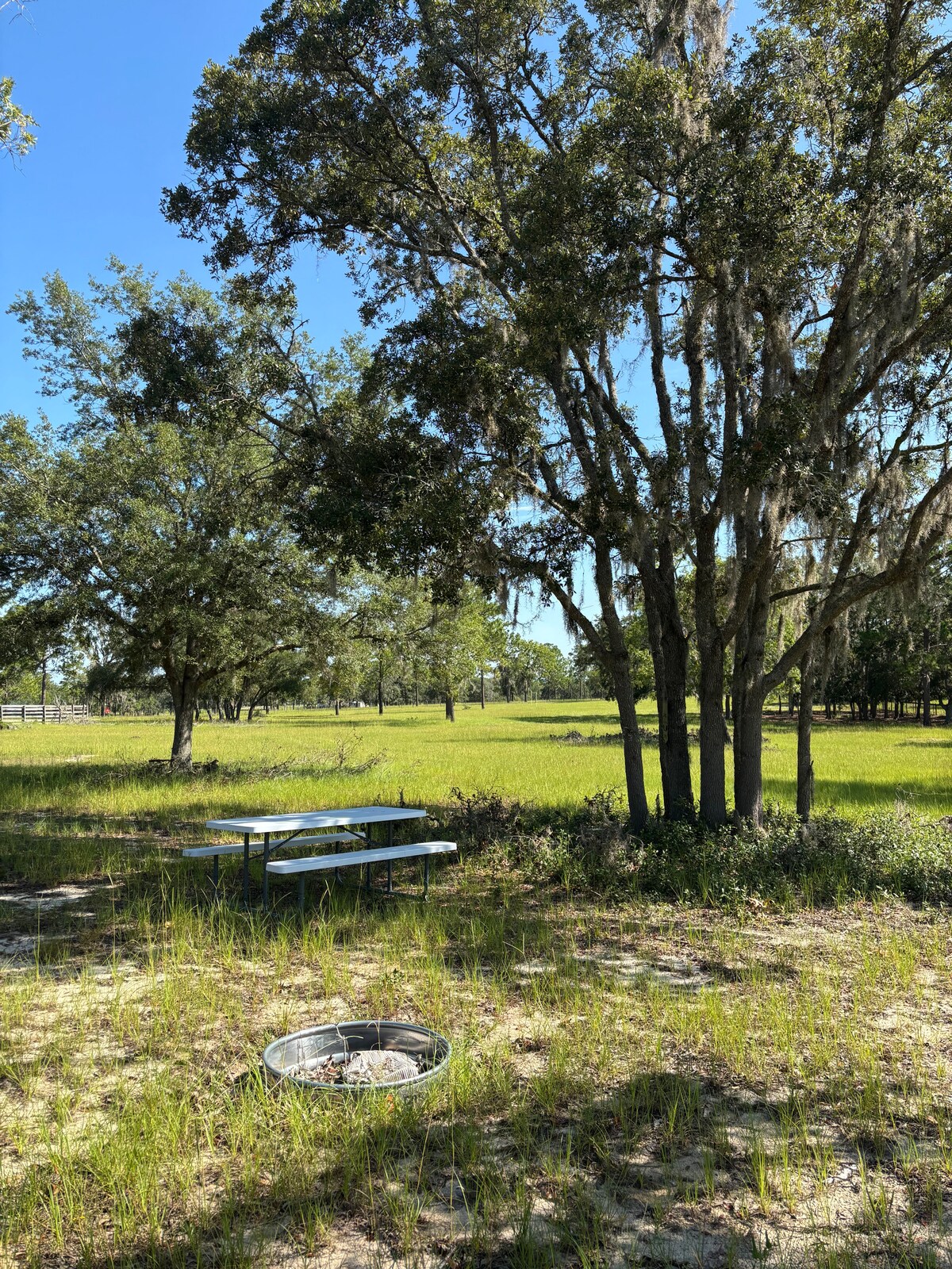 . Este es solo un sitio PRIMITIVO. Por un camino de grava oculta con humedales a cada lado encontrarás un campo completamente vallado rodeado de pinos, robles y arces de pantanos. Hay dos estanques ubicados en la propiedad, ambos repletos de lubina, bluegill y Sunfish. El estanque delantero alberga mucha vida silvestre natural de Florida y es una excelente ubicación para observar aves. Nos encanta que hayas traído a tu mascota, pero también queremos mantener la nuestra segura, así que mantén a todas las mascotas con correa o plomo.