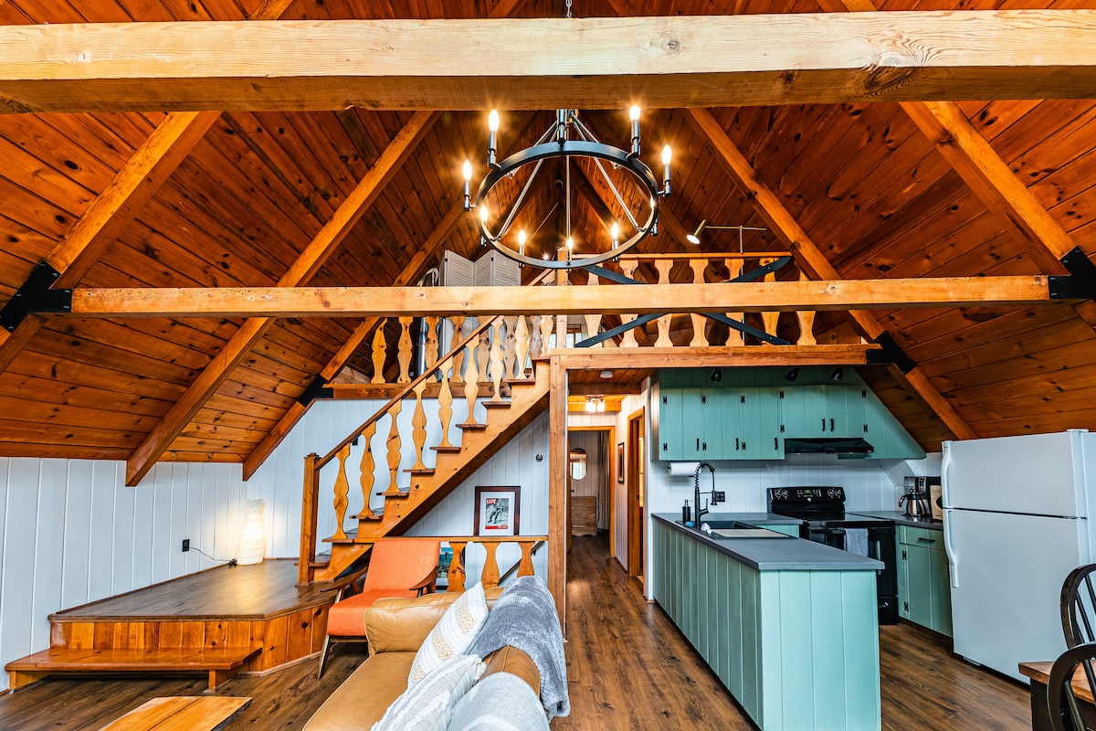 Disfruta de la tranquilidad de la naturaleza cuando te hospedes en esta casa alpina limpia y moderna con capacidad para 6 personas. ¡Se admiten mascotas y se remodela para la escapada romántica perfecta o diversión para toda la familia! Con 120 pies de acceso seguro frente al lago y vistas, una chimenea interior y dos al aire libre y muchas sillas Adirondacks para todos. Este marco A ofrece wifi de alta velocidad y streaming. A 15 minutos de restaurantes, campo de golf, esquí, motos de nieve, rutas de senderismo y ciclismo, festivales de música en verano.