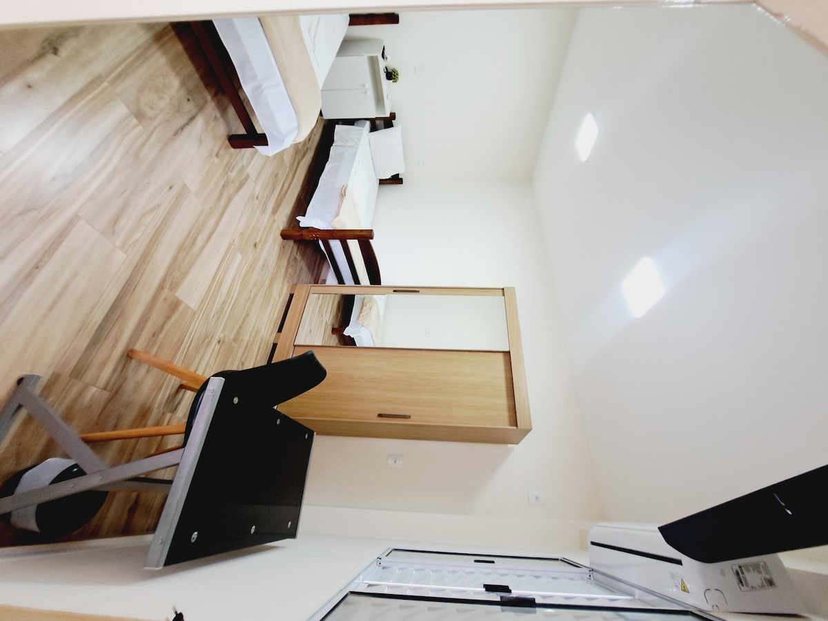 Casa loft (dúplex) para parejas con sala de estar y cocina integrada, baño en la planta baja, balcón y dormitorio en el entrepiso con balcón abierto en un condominio en un barrio noble y tranquilo de Brasilia. Lugar cerrado, vallado, seguro, acogedor, muy arbolado, con estanques artificiales, 3 zonas de fogata diferenciadas, senderos para caminar dentro del terreno y opciones para senderos guiados a caballo, a pie y en bicicleta por nuestro socio @nas_trilhas_do_park_way.
