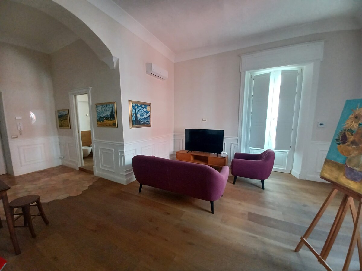 El apartamento está situado en el corazón del centro histórico de Salerno, en el tercer piso de un elegante edificio del siglo XVIII, con balcones con vistas a Via Roma y Piazza Amendola. Desde aquí se puede llegar fácilmente a pie a la famosa playa de S. Teresa, el Duomo, los mejores restaurantes y las calles comerciales. Excelente ubicación para tomar el ferry a la costa de Amalfi, Capri e Isquia. Se puede llegar fácilmente a pie a la estación de tren para visitar Paestum, Nápoles y Pompeya.