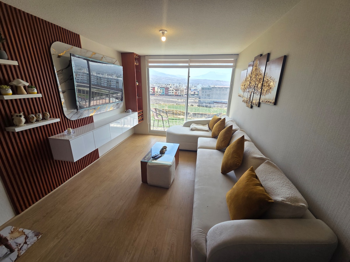 Disfruta de un departamento en estreno en el 5to piso de un edificio moderno, con cerradura principal de ultima tecnología, ubicado en una tranquila urbanización de Arequipa. Ofrece 1 habitación comoda y acogedora con baño privado, cocina-comedor tipo americano y una amplia zona de parrillas ubicada afuera del departamento con una vista preciosa a todos los volcanes y a todo Arequipa. Servicios de wifi y TV con canales y peliculas de streaming NO se aceptan mascotas, fiestas y reuniones