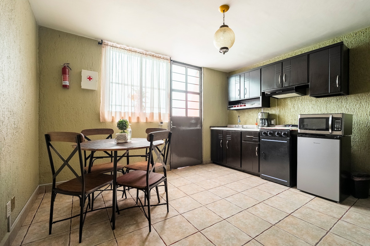Este es un apartamento de 57 metros cuadrados con techos de ladrillo muy altos, una gran sala de estar y comedor con mucha luz. Encuentra auténticos muebles chic de mediados de siglo y varias obras de arte. El apartamento tiene un dormitorio privado con cama tamaño queen, armario y baño y una cocina independiente con suministros. También cuenta con dos pequeños patios interiores para la luz y la ventilación. En la restauración se conservaron muchos detalles arquitectónicos originales de 1940, como suelos, paredes de ladrillo, techos y marcos de ventanas. El proyecto apareció recientemente en Architectural Digest México y ganó varios premios importantes de arquitectura: Architecture Masterprize y NoldiSchreck. Los huéspedes pueden hacer uso de todo el apartamento. También puedes pasar el rato en el patio interior del apartamento y en el vestíbulo del primer piso. También hay un cuarto de lavado con lavadora y secadora que puedes usar junto al garaje. Santa María La Ribera es un barrio histórico del siglo XIX. Pasea por el Parque de la Alameda de enfrente y visita el cercano Museo de Geología. Aquí, contempla fósiles de mamuts y dinosaurios, además de pinturas del famoso maestro mexicano José María Velasco. Encontrarás muchas opciones de transporte público, como metro, metrobús (línea directa al aeropuerto y al centro histórico), tren, autobús y sistema de bicicletas públicas (ecobici). La línea 4 norte del metrobús es una conexión directa desde las terminales T1 y T2 del aeropuerto hasta Buenavista y viceversa. Tarda unos 45 minutos. 30 pesos por persona, se necesita una tarjeta de metro recargable. Forma segura, rápida y directa desde y hacia el aeropuerto.