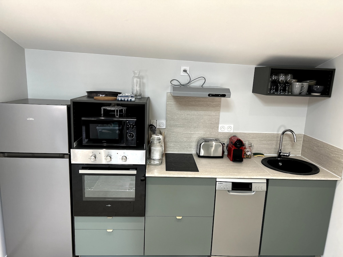 Estudio con aire acondicionado cálido y limpio, con todas las comodidades, muy tranquilo de 21 M2 con entrada independiente sin promiscuidad. Café de bienvenida, expreso, té, agua mineral,magdalenas,leche,mantequilla,cruasán, mermelada,microondas, Bicicleta en préstamo a su disposición Cerca del famoso restaurante LES GRANDS BUFFETS, el zoológico, el centro de la ciudad y las playas. Aparcamiento a 10 m para su vehículo (garaje para motos) Autobús en las cercanías para llegar al centro de la ciudad. Un televisor de 32" a su disposición en el estudio.