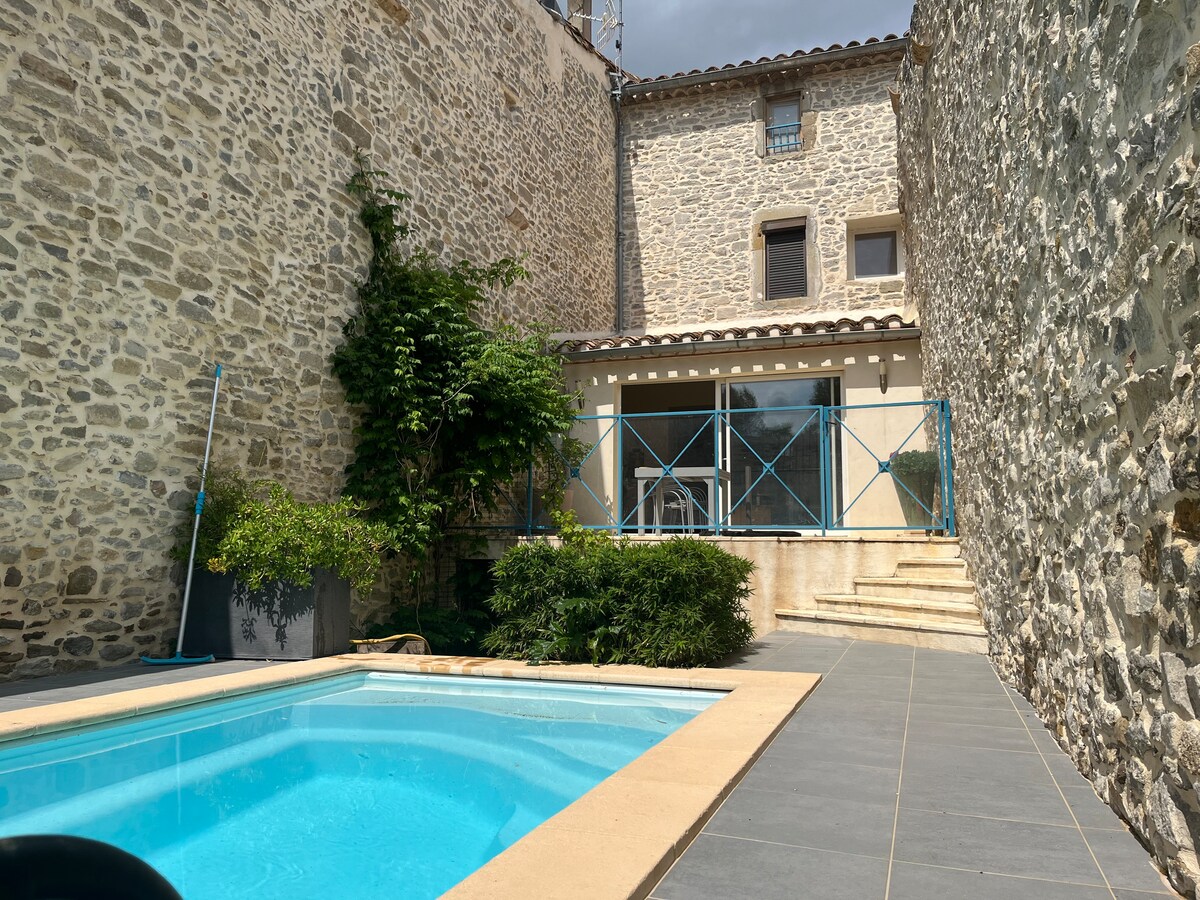 Maison de village atypique calme et sans vis à vis, située dans le pittoresque village médiéval de Cesseras au coeur du terroir Minervois; elle comprend 110 M2 répartis sur trois niveaux avec sa piscine privée réservée exclusivement aux locataires. Cuisine équipée (lave-vaisselle, four, plaque de ci, micro-ondes), 2 salles de bain . Lit valise, chaise haute pour bébé. Espace bureau. Capacité d accueil : 6 personnes. Idéale pour les séjours en famille dans l arrière pays, proche de la mer.