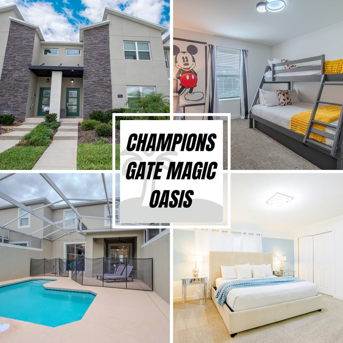 ¡Imagina pasar las vacaciones a tiro de piedra de todos los parques temáticos de Disney mientras te hospedas en un centro vacacional que también ofrece entretenimiento familiar! Los sueños familiares se hacen realidad en esta nueva casa adosada, donde encontrarás una cocina totalmente equipada y todo lo necesario para una estancia cómoda. Todo esto, además de acceso a las características del centro vacacional de recreación y entretenimiento, que incluyen una gran piscina de entrada a la playa, un parque acuático, minigolf, gimnasio y cancha de voleibol. ¡A ver cuántos «Mickeys ocultos» puedes encontrar en la casa!