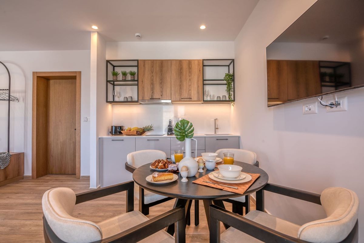 Whether you are traveling in couple or with family or friends feel free to reserve one out of the two "One Bedroom Apartments". Placed at a lower level of the complex, they offer a perfect spot for relaxation. With their private terraces and their cozy interiors that will make you feel at home, it is certain that your holidays are going to be one of a kind.