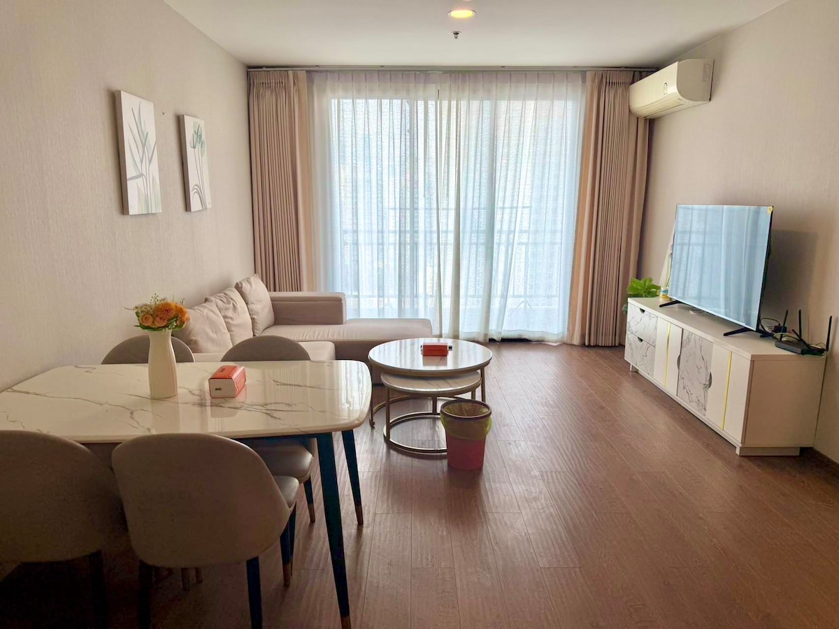 Refugio urbano chic a pasos de BTS Phra Khanong Disfruta de la comodidad moderna en este luminoso departamento de un dormitorio a pocos pasos de BTS Phra Khanong, perfectamente ubicado para explorar Sukhumvit o trabajar desde la ciudad. • Espacio habitable lleno de luz con ventanas del piso al techo • Cama tamaño queen con cortinas opacas para un sueño profundo y reparador • Wifi ultrarrápido y un televisor inteligente de 55 pulgadas (compatible con Netflix), ideal para trabajar o relajarse