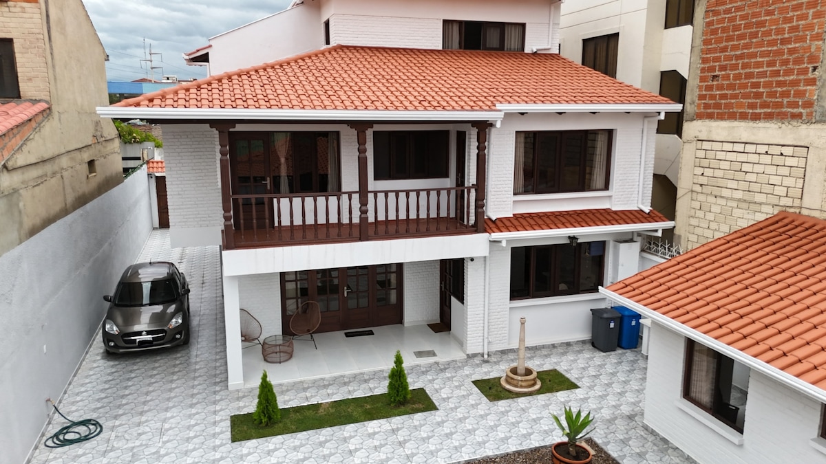 Hermosa casita en la mejor zona residencial de Cochabamba! Muy acogedora. Céntrico pero sin la bulla, a solo minutos de buenos restaurantes, parques. Mercados, supermercado y farmacias a menos de 3 cuadras a pie. Fácil acceso al transporte publico. Seguro y calmado barrio con seguridad privada. Gran jardin con juegos, con comedor y parrillero (a gas), canchita de basketball. 2 dormitorios con ropero empotrado (cuna disponible a pedido). Baño con ducha caliente y cocina con todos los utensilios.