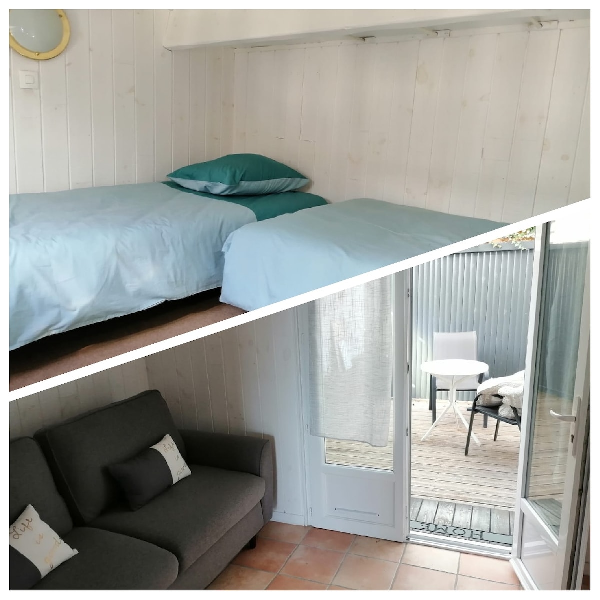 Venga a descansar en este acogedor alojamiento con patio privado, cerca del mar con hermosas puestas de sol. Situado a 15' de La Rochelle y a 20' del puente de la isla de Ré. Encuentre todo su confort con una cocina equipada: microondas, placa de inducción, cafetera, hervidor de agua… Un cuarto de baño con toallas y secador de pelo Relájese en una cama queen size de 160 cm con colchón de hotel (sábanas incluidas) con vestidor. TV equipada con Chromecast y Netflix, wifi gratuito.