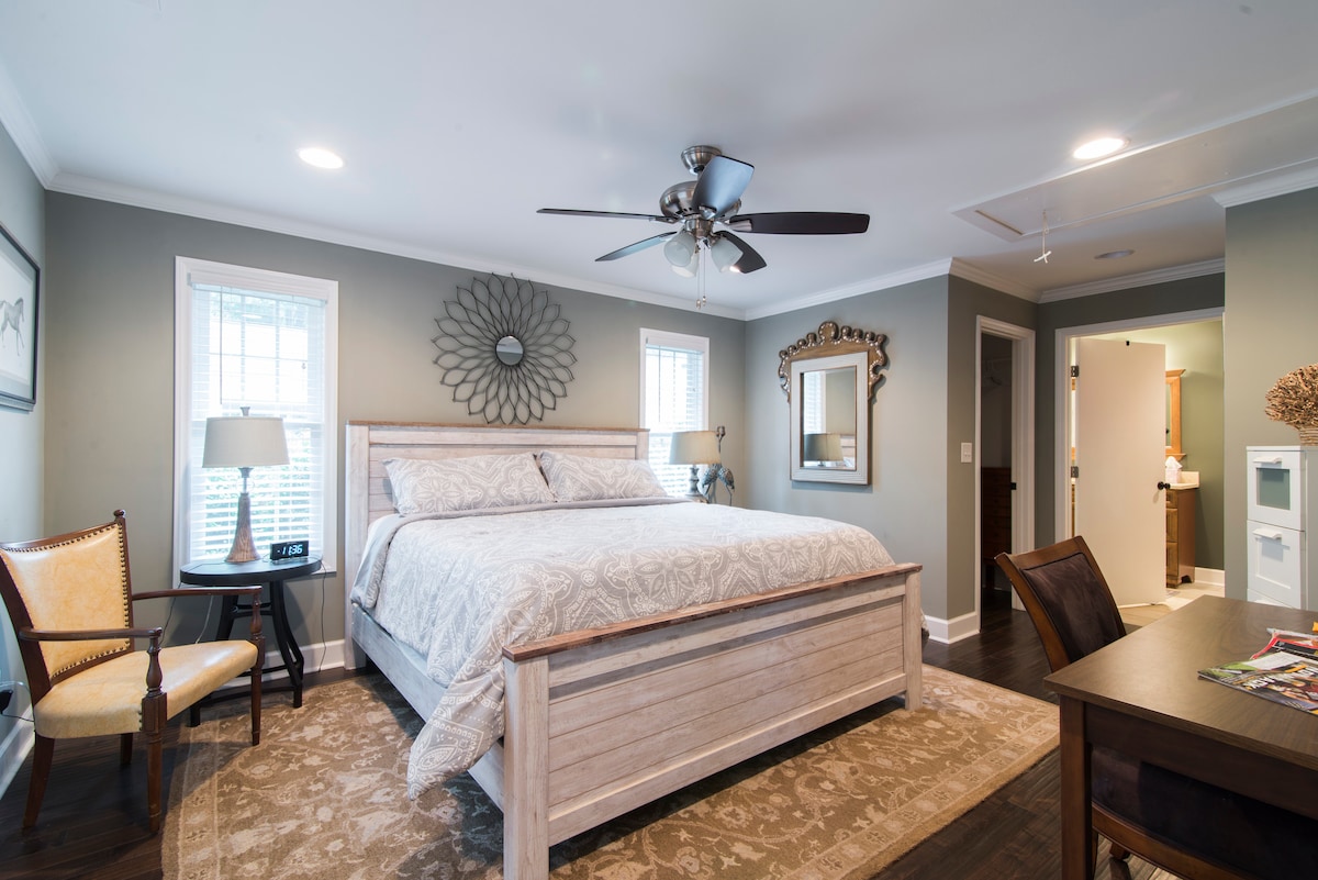 Una acogedora casa de huéspedes de 750 pies cuadrados ubicada en un barrio tranquilo a 2 minutos del campo de golf Quail Hollow. A cinco minutos del centro comercial SouthPark, a 15 minutos del centro de Charlotte, Carowinds y el aeropuerto. Para los corredores, a menos de 5 minutos trotando/caminando del hermoso sendero Little Sugar Creek Greenway. Un dormitorio con cama tamaño king. Cocina totalmente equipada. Sofá doble reclinable en la sala de estar. 2 televisores de 50 pulgadas, wifi, televisores inteligentes. Solo streaming. Perfecto para el ejecutivo, suegra, abuelo, turista, escapada de pareja.