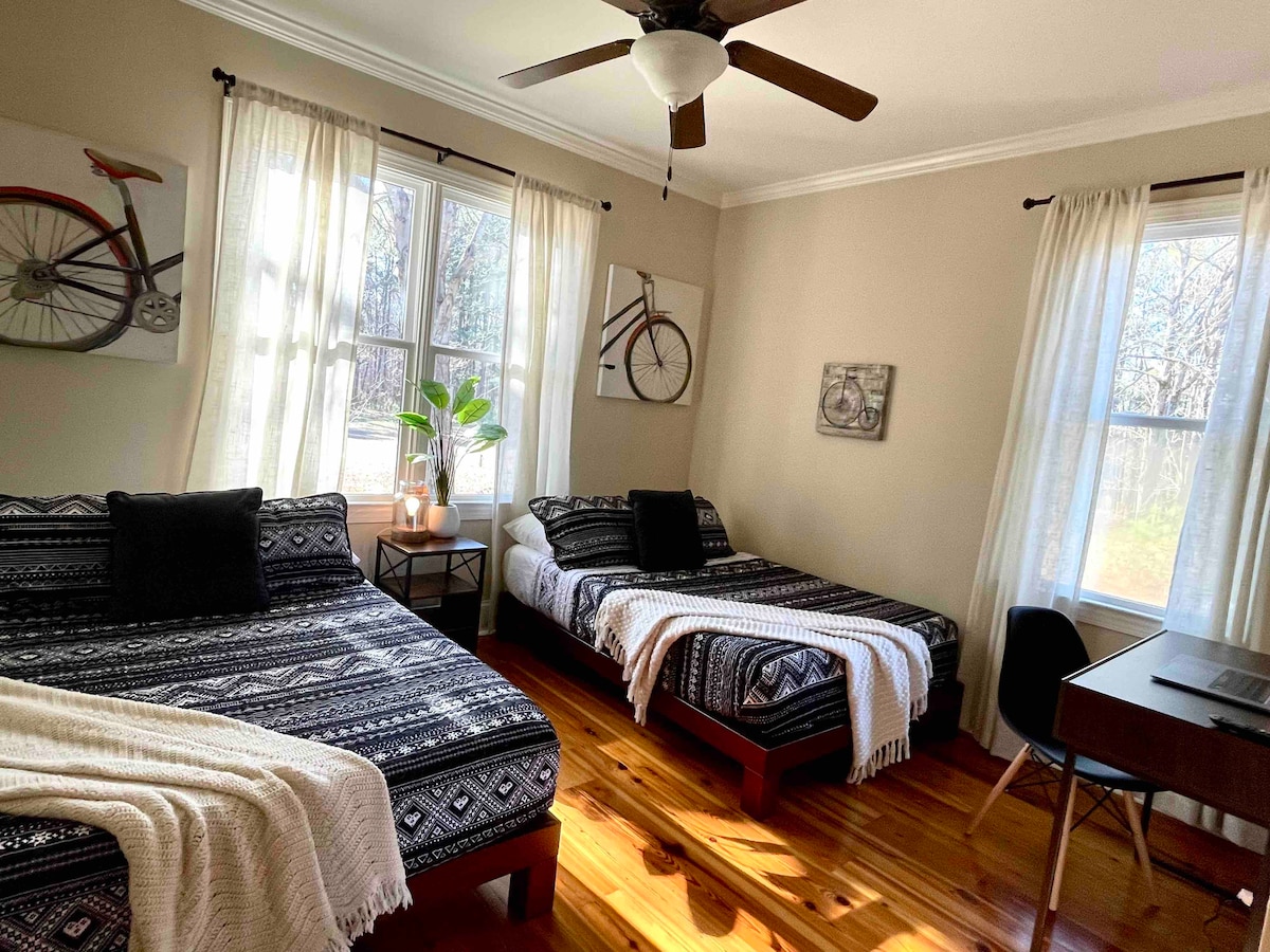 Escapa a la tranquilidad en este encantador oasis de media hectárea junto a un maravilloso parque estatal y a minutos de los lugares de interés locales. Bebe té en los porches con vistas a jardines exuberantes. Relájate bajo la sombra moteada del roble. Entra en los pisos de madera originales, una cocina moderna, camas acogedoras y toques artísticos en todas partes. Ya sea en solitario o con tus seres queridos, este exclusivo retiro en la aldea de Bynum te envuelve en calma. Pasea por la orilla del río o por la ciudad y deja que las corrientes te relajen.