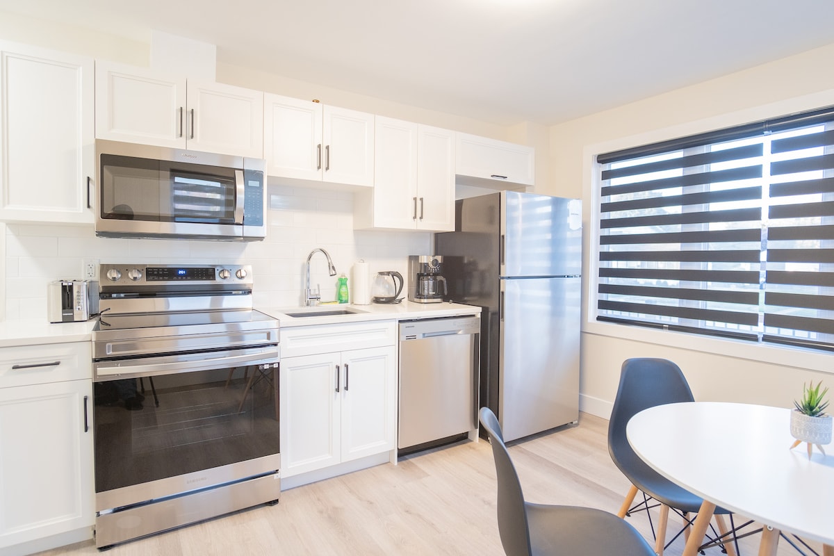 Quiet, freshly renovated upper unit apartment in a fourplex. - 1 bedroom & 1 bathroom, - Self-check-in - Stairs required The space LIVING ROOM- - TV with Netflix and YouTube BEDROOM #1 - Queen bed KITCHEN - All the kitchen items required for cooking your favourite meal - Small dining room table - Enjoy a complimentary hot cup of coffee or tea in the morning - Please note there is no dishwasher/it does not work. BATHROOM - Marble tiled stand up shower