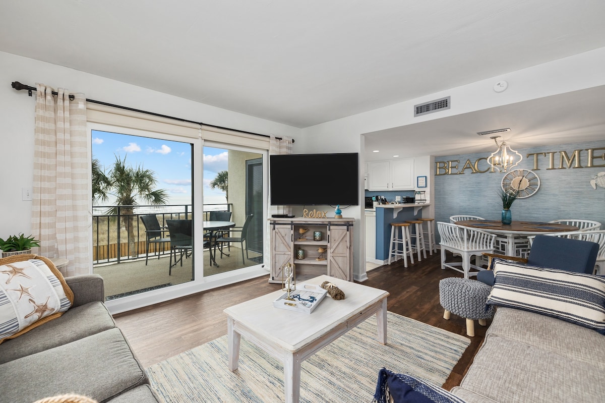 ¡Tu búsqueda ha terminado! Este apartamento de 3 dormitorios y 2 baños tiene todo lo que necesitas para tus próximas vacaciones. Desde el desayuno con vistas a la playa hasta margaritas mientras observas las olas por la noche, este apartamento hará que quieras quedarte más tiempo. El acceso privado directo a través de nuestra pasarela fácil de navegar hasta la playa hace que sea muy fácil transportar todos tus juguetes de arena o volver corriendo para reponer la nevera, las impresionantes vistas al mar te dan la bienvenida desde la suite principal. Escucha el sonido tranquilo de las olas por la noche.