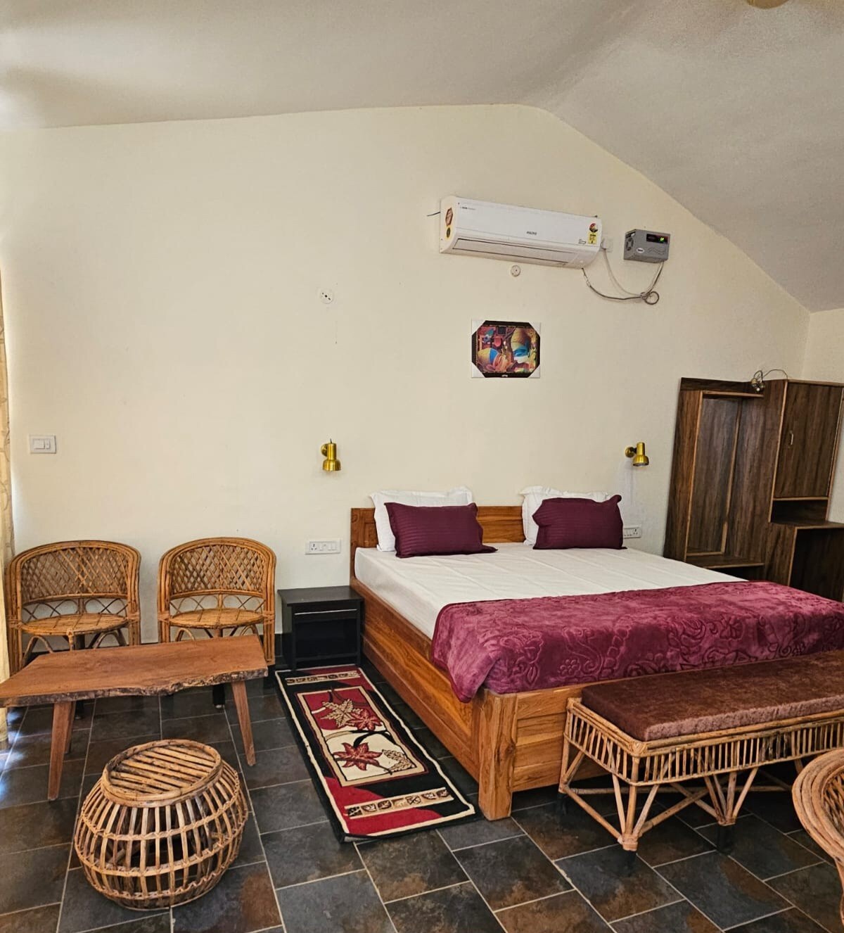 A Solar-powered jungle farm-stay with four rooms at Kanha National Park. We are off the gird, the life is simple but the experience wild. We have 4 family rooms, two in the main Homestay Makaan and two Large Huts. We can easily accommodate 12 people. The cost is per person per night with breakfast. Breakfast is VEG. If you want all meals there is a per plate price extra payable at Kamp. Children under 5 are FREE