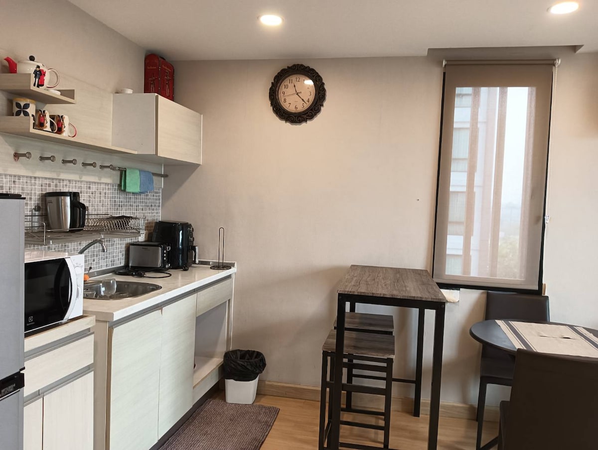Una elegante habitación de condominio con áreas separadas de estar y para dormir, una cómoda cama tamaño king y una cama plegable en el piso para un huésped adicional, nuestro espacio es perfecto para parejas o familias pequeñas. Disfruta de la acogedora sala de estar con un comedor dedicado. Accede a instalaciones compartidas de alta calidad como un gimnasio, una piscina, creando un ambiente de resort. Además, aprovecha nuestra conveniente ubicación a pocos pasos del centro comercial más grande de Chiang Rai.