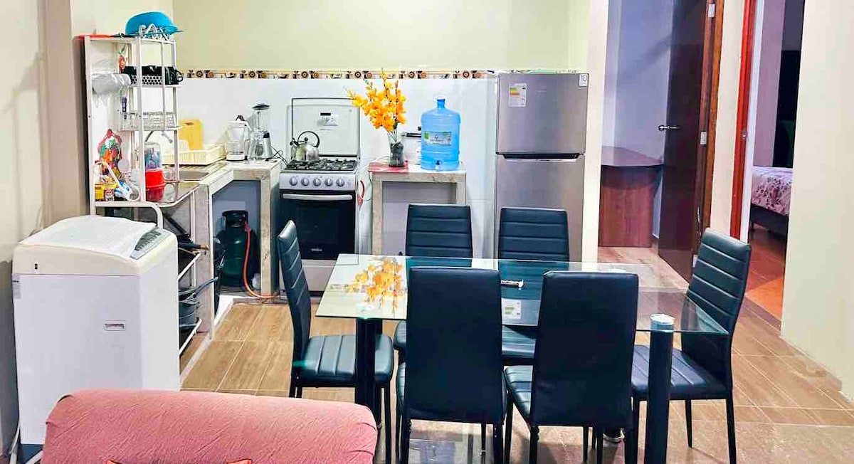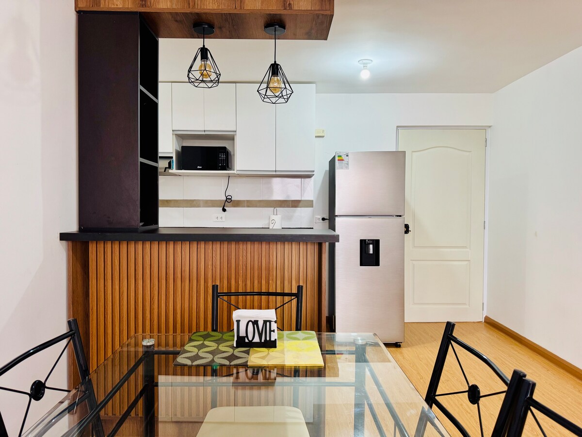 Apartamento 4to piso con vista a la calle, muy amplio, confortable y acogedor. Full equipo con Smart TV. Internet wifi rápido. Cocina moderna y muy bien equipada. Habitaciones súper confortables y bien amobladas. Zona tranquila y segura. Zona con bodegas, lavandería, restaurantes, menús, y paradero de taxis seguros. Acceso rápido a través de la Av Colectora Comunicación constante para cualquier inconveniente o pregunta. Te esperamos!! :)